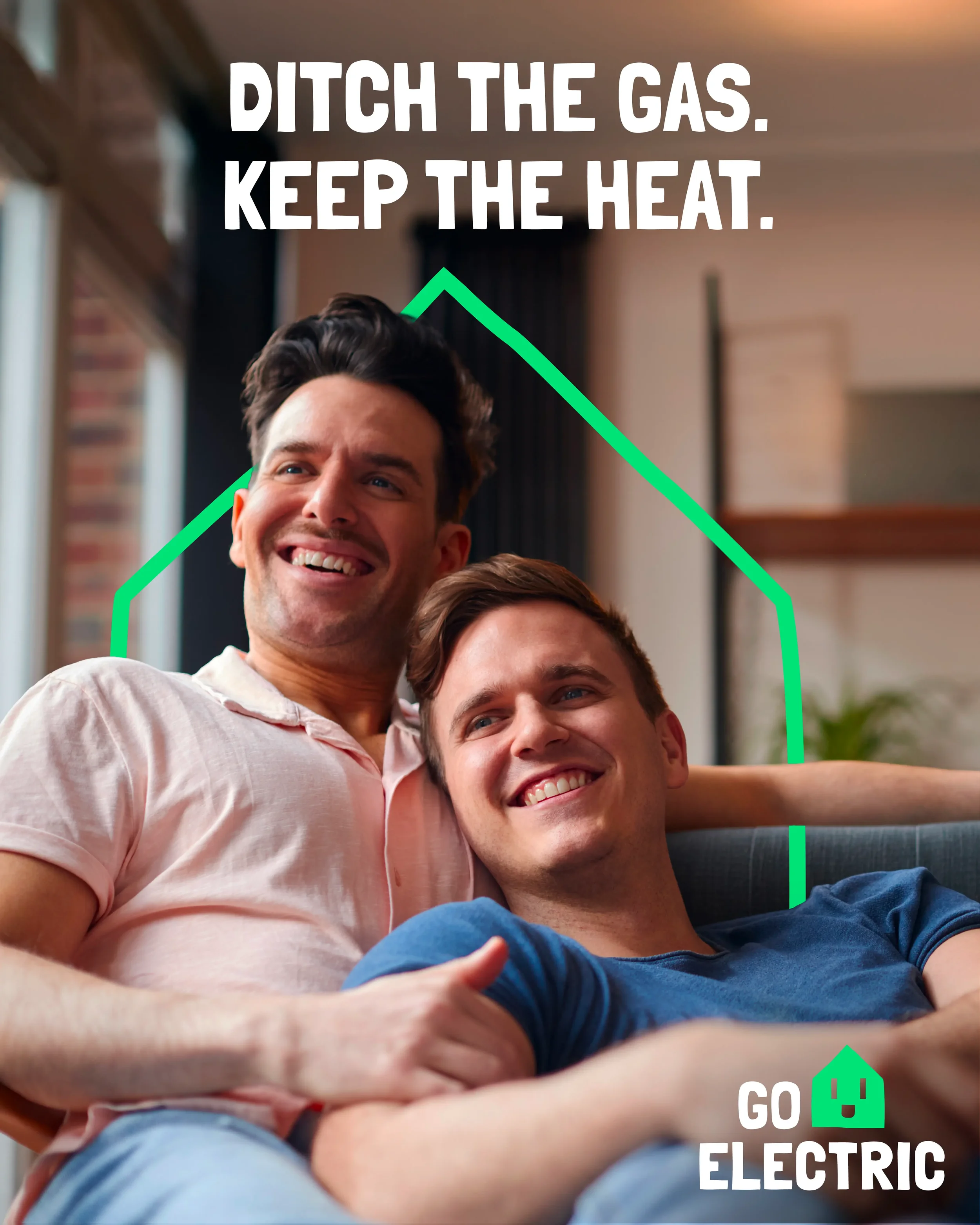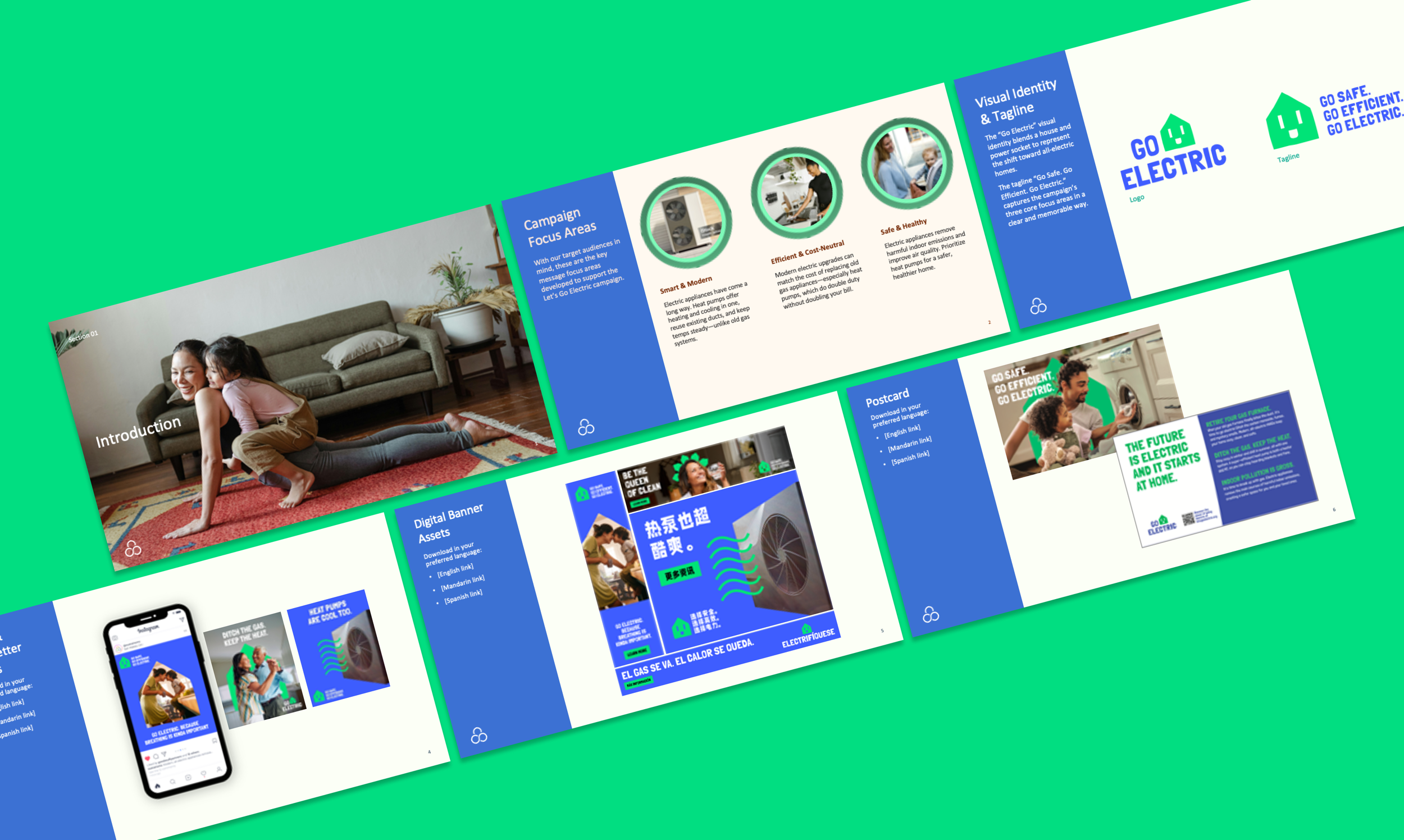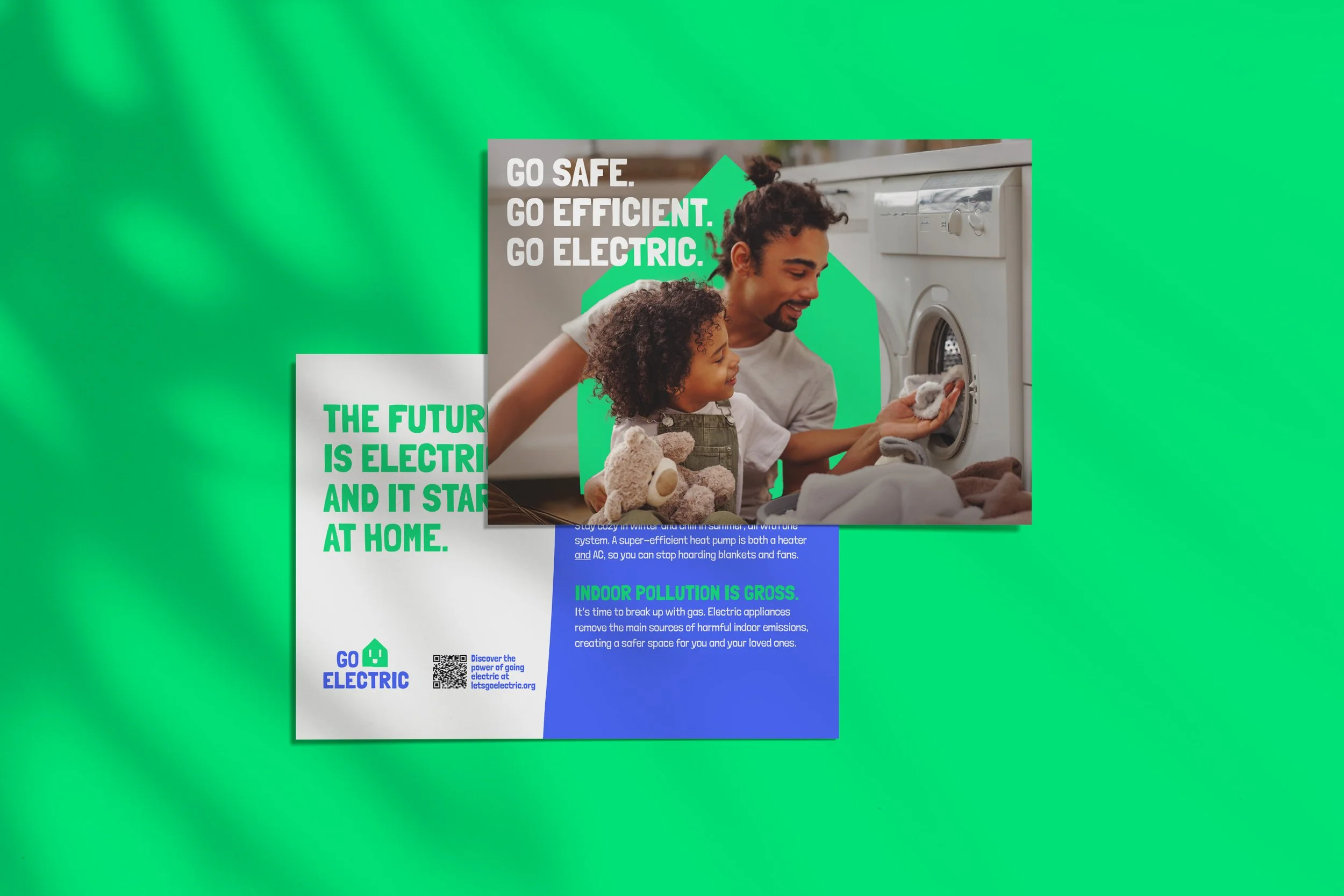 To stand out from the institutional government look, we created a bold, bright campaign identity that deliberately broke from the expected “green energy” look. The campaign logo blends a house and a power socket to represent the shift toward all-electric homes.